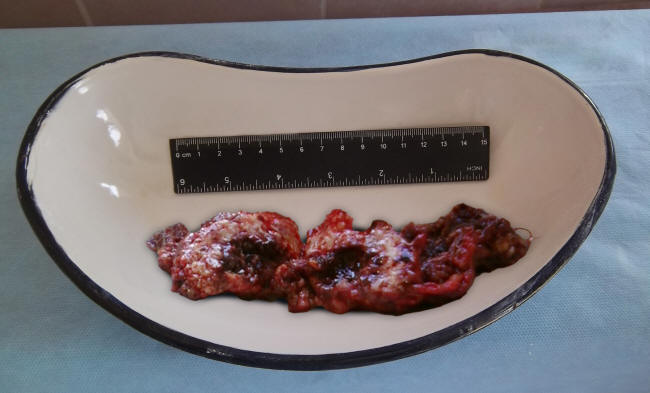 ![]() Click for large image | Figure 1. The resected specimen: a part of the greater omentum with the abscess cavity in the middle. A caprone ligature (not shown) was removed from the abscess. |